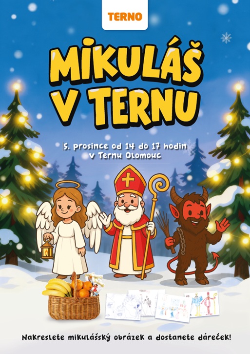 V pátek 5. prosince dorazí do Terna Olomouc Mikuláš se svou družinou! Přijďte s dětmi mezi 14:00 a 17:00 a užijte si pohodové předvánoční odpoledne plné adventní atmosféry.