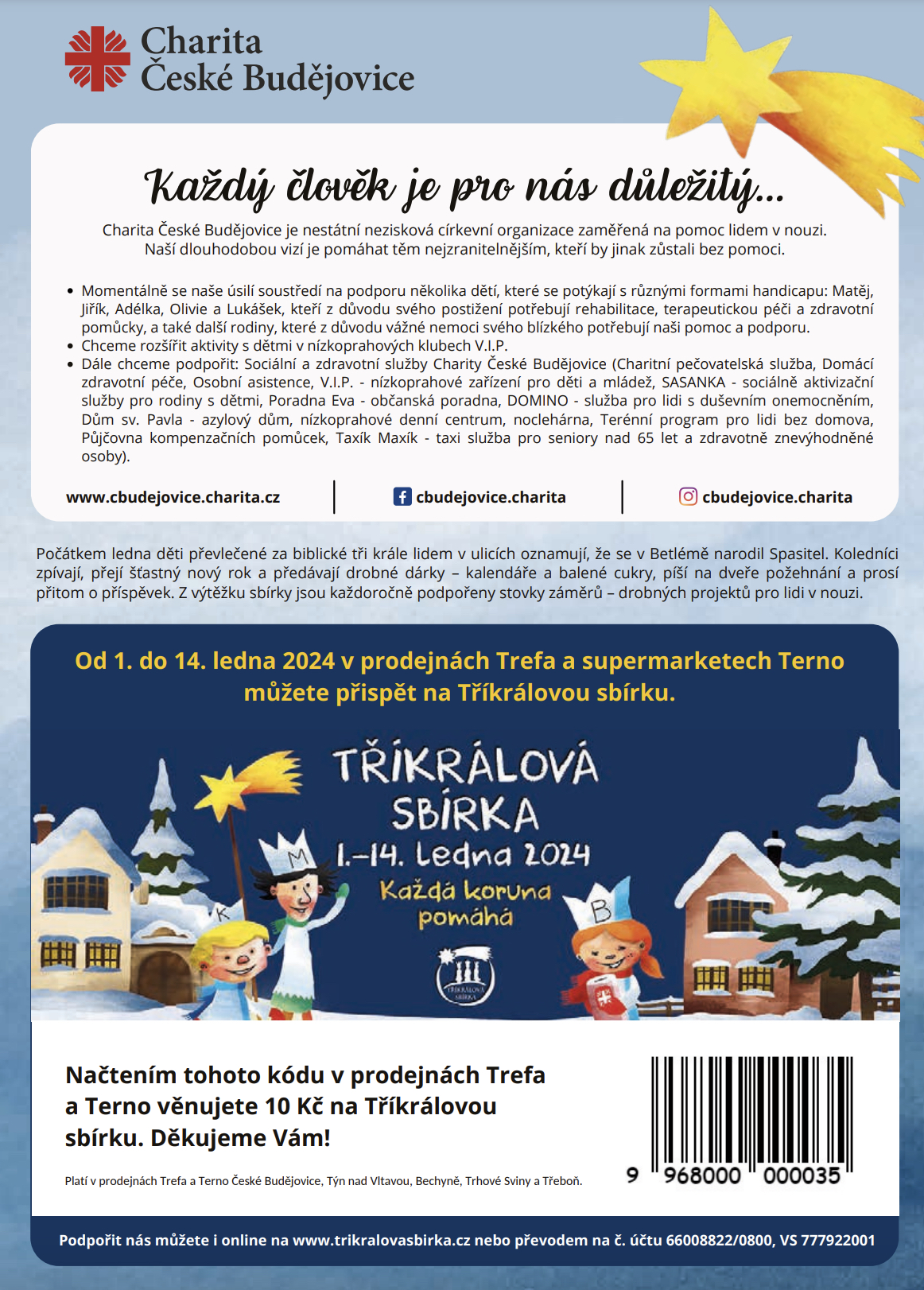 Od 1.1. do 14.1.2024 se na naší prodejně můžete přispět do Tříkrálové sbírky Charity České Budějovice.