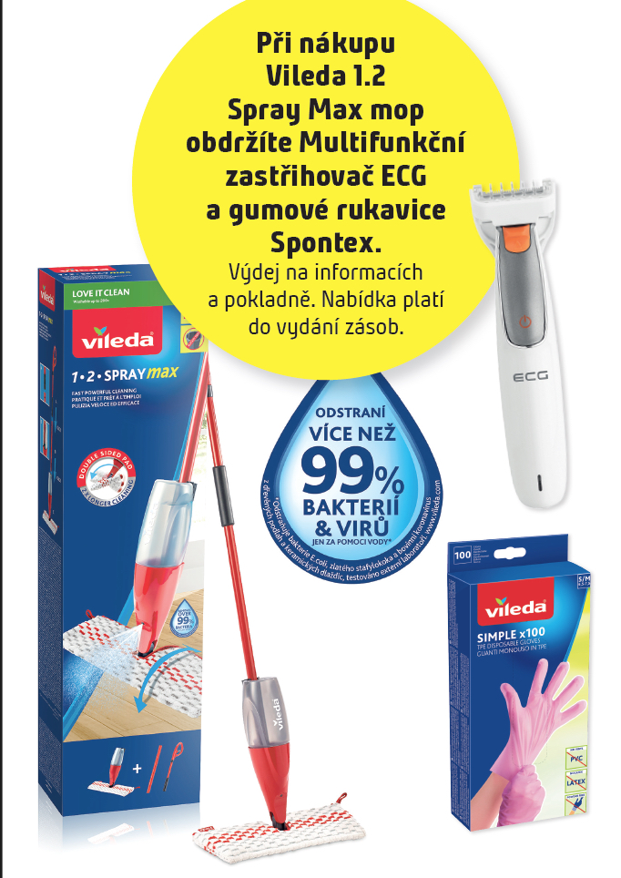 Kupte Vileda 1.2 Spray Max mop a na informacích nebo pokladně obdržíte Multifunkční zastřihovač ECG a gumové rukavice Spontex.